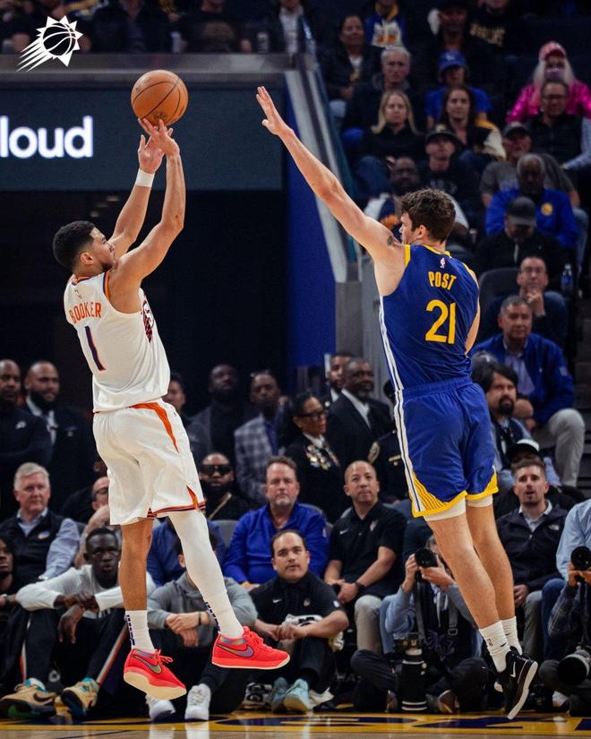布克上半场砍下了17分,第3节再得17分。末节,布克还在努力追分。在布克的率领之下,太阳一度看到了逆转取胜的曙光。不过,穆迪、库里的稳健发挥,让布克全场的努力功亏一篑。